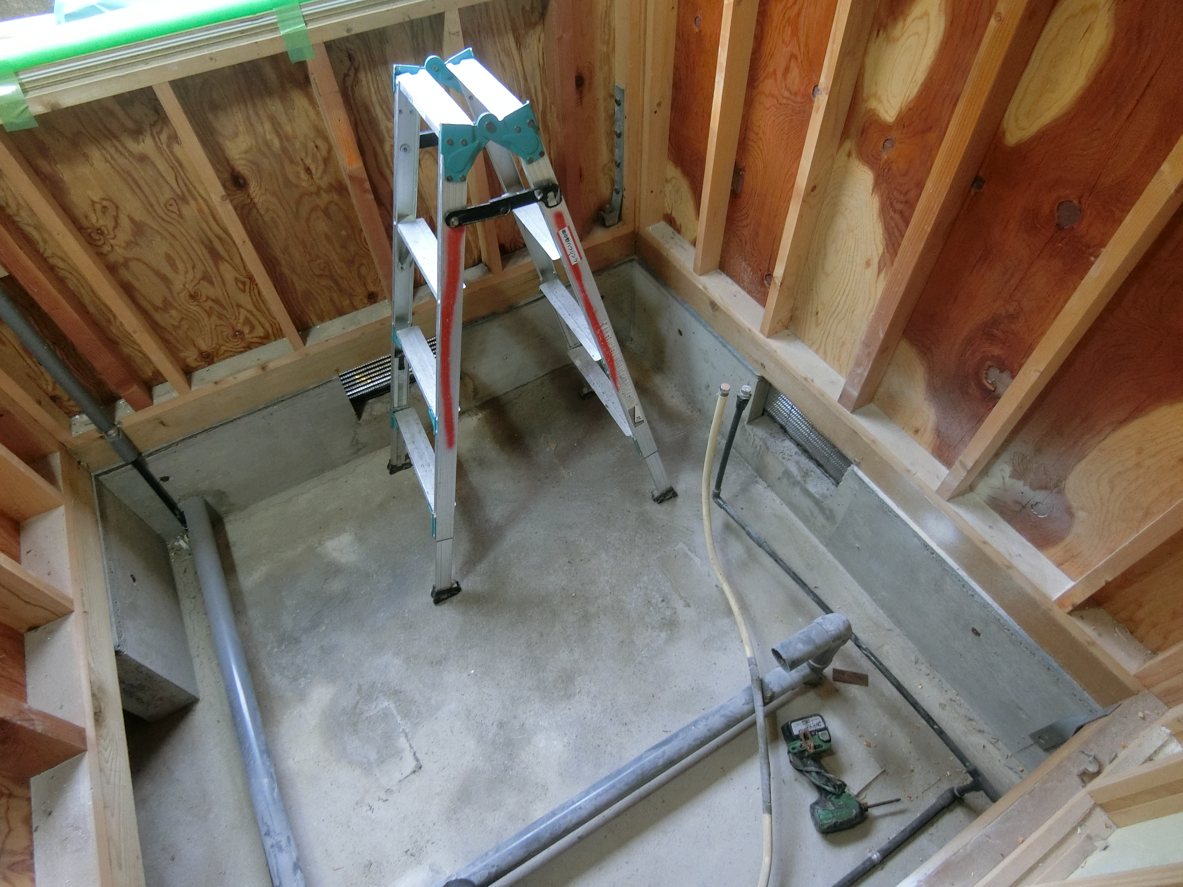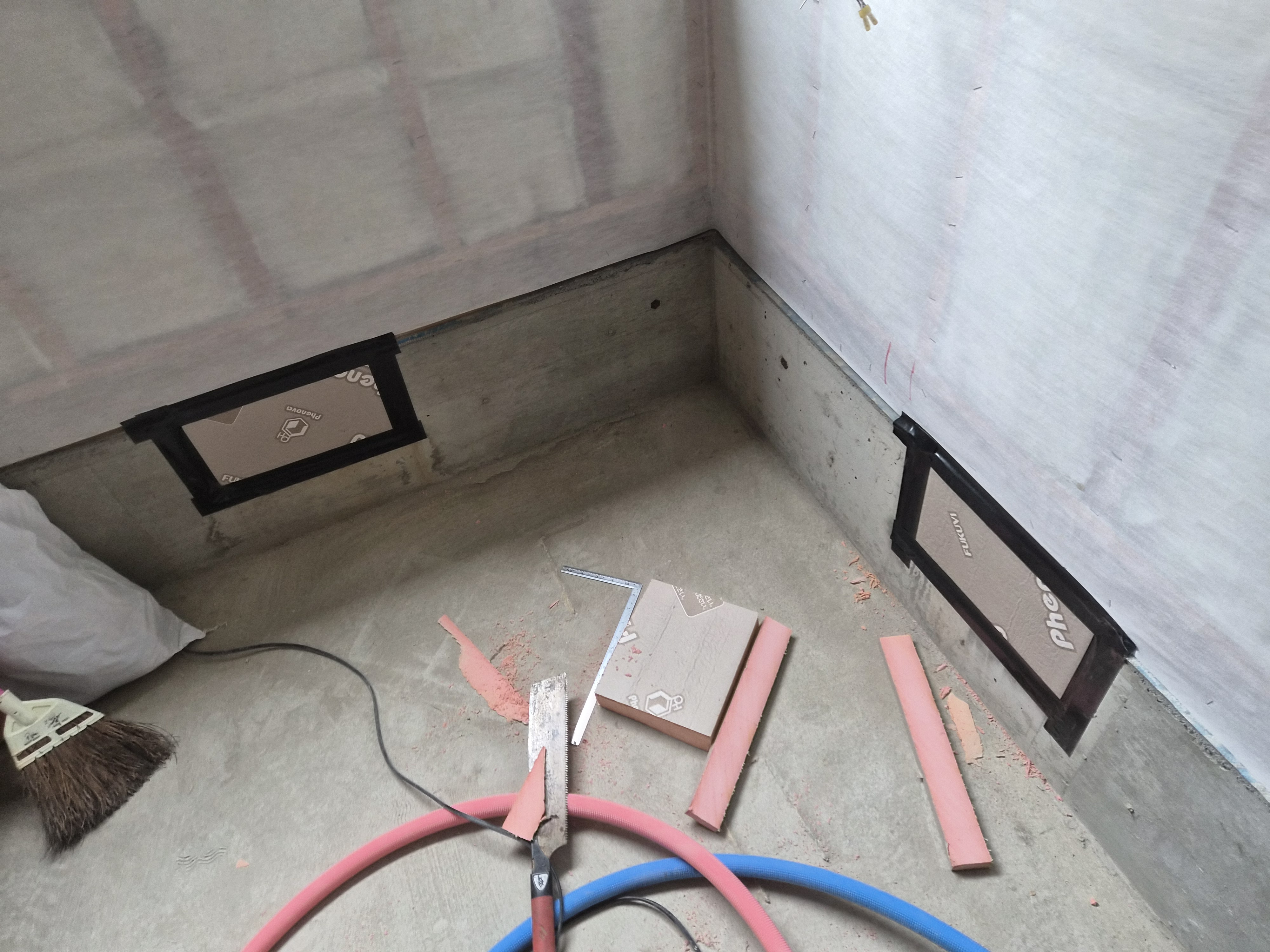 基礎まわり: 床下換気口をフェノバボードで塞ぎ、基礎と土間にも同じくフェノバボードを施工。